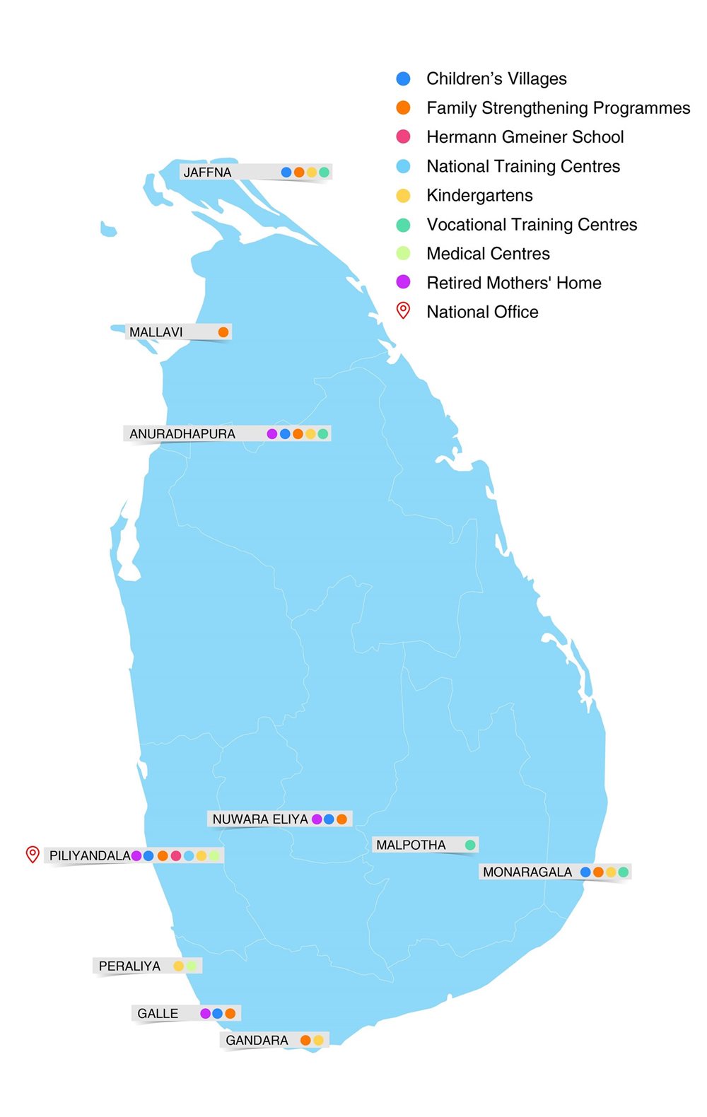 We help in over 138 countries over the world. We have been working in Sri Lanka for 43 years with 6 Children’s Villages located in Piliyandala, Nuwara Eliya, Galle, Anuradhapura, Monaragala & Jaffna.